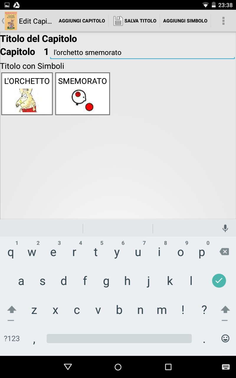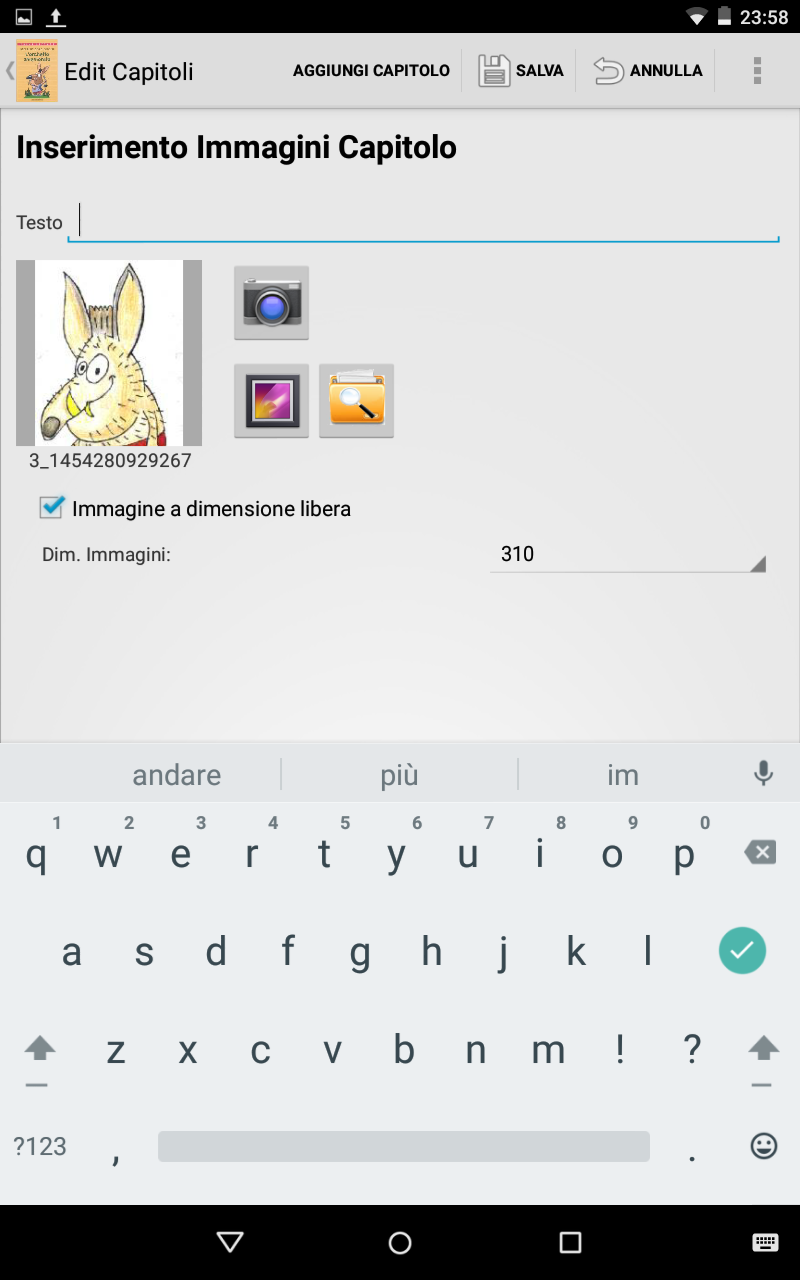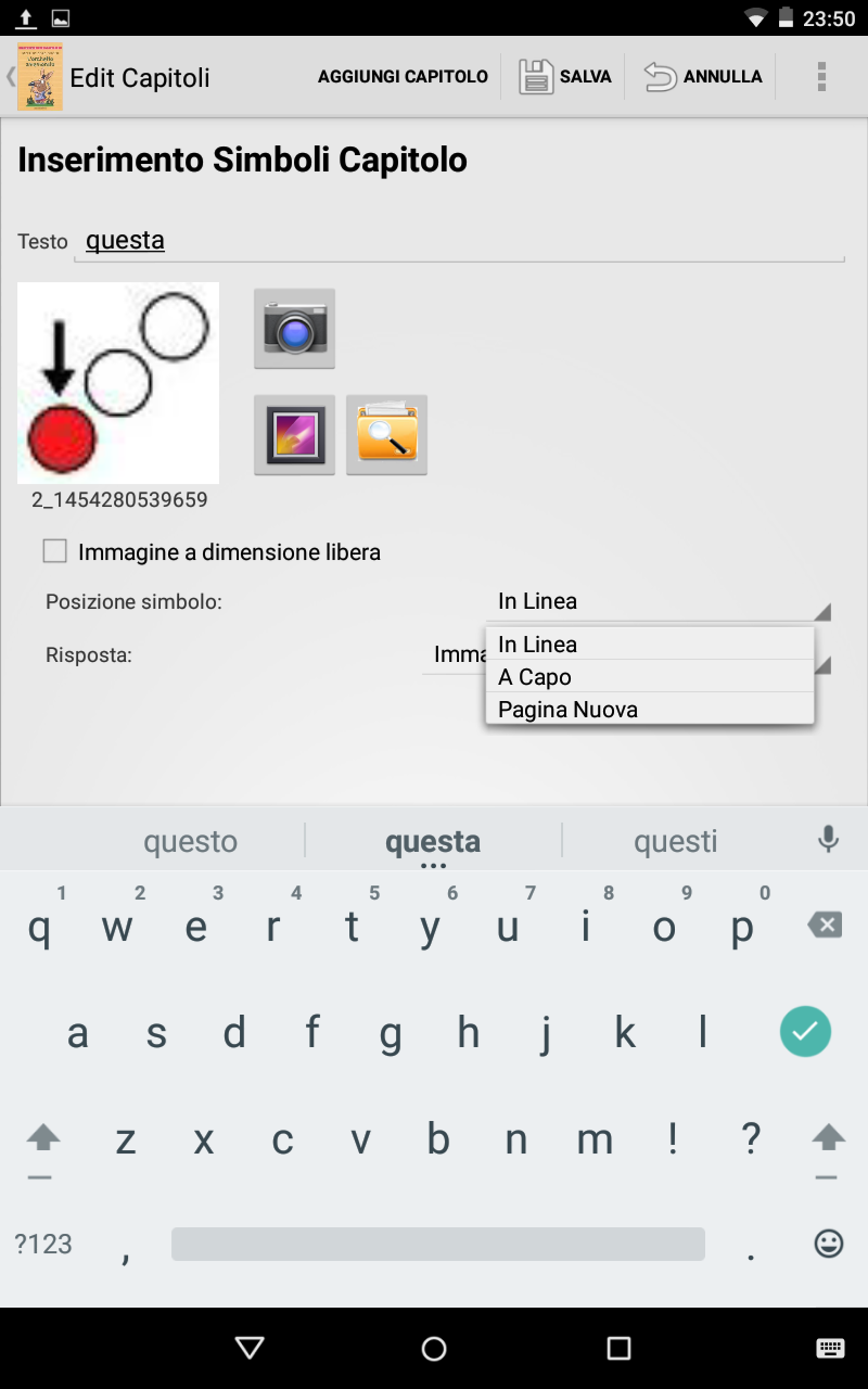 Aggiungi Simbolo: aggiunge un simbolo per poter inserire le immagini che compongono il titolo del capitolo. Si apre subito la schermata di inserimento dell'immagine.