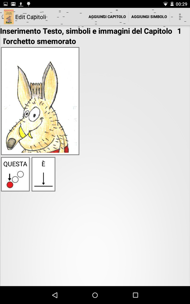 Identificate la storia e traducetela in simboli su carta, ovvero con carta e penna. Per semplicità sono partito da un libro messo a disposizione dalla scuola Don Milani di Prato realizzato da Lucia Chirici. Tutte questa parte ovvero quella di tradurre una storia in simboli semplificando il testo, scegliere le immagini dei personaggi, scegliere immagini di contorno e realizzare la storia vera e propria, in realtà è quella più complessa. Se è per uso personale, l'ideale è partire da libri in simboli o standard ed utilizzare le immagini del libro stesso, altrimenti dovreste avere il consenso dell'autore o della casa editrice o, se siete bravi, realizzate i disegni dei personaggi da voi e/o utilizzate immagini libere da eventuali diritti. Finita questa fase ho quindi su carta( stampata o scritta a mano) uno storyboard su cui basarmi durante la creazione.