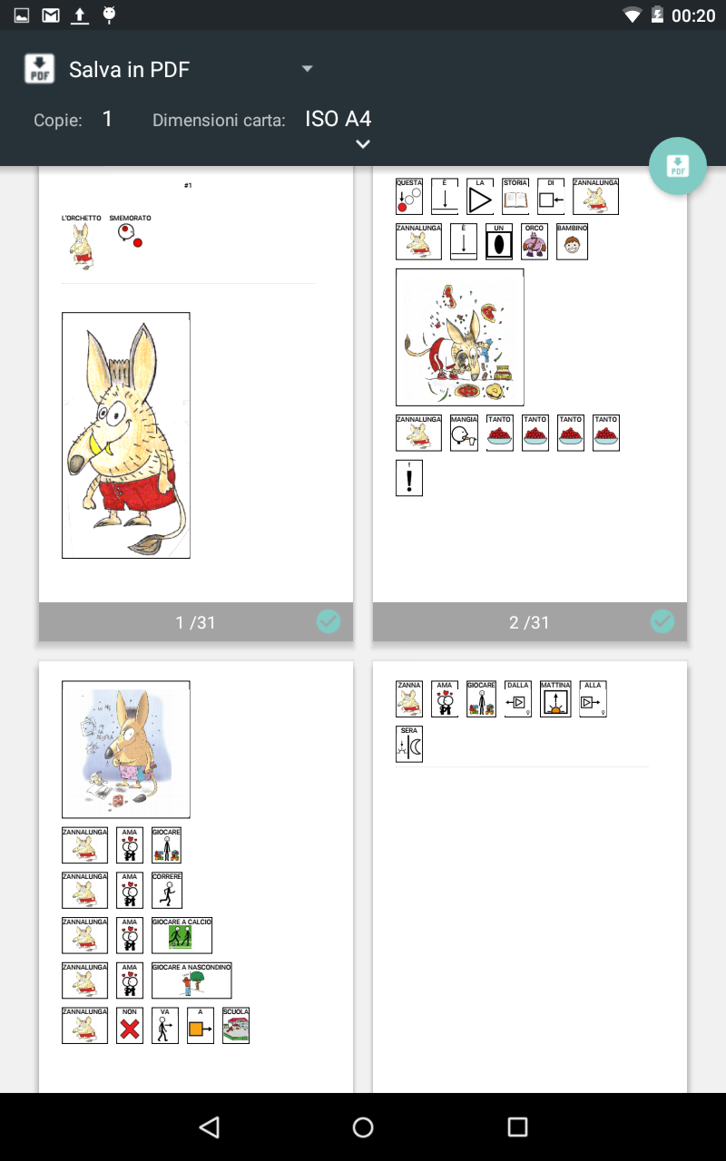 Stampa: permette di inviare tramite il sistema di stampa android il libro in stampa. Potrà essere quindi stampato su una qualsiasi stampante installata o salvato in pdf (in genere è una delle possibilità se avete installato le applicazioni google documents). L'anteprima di stampa è anche utile per vedere come sta venendo il libro, senza per forza dover andare in fase di esecuzione.