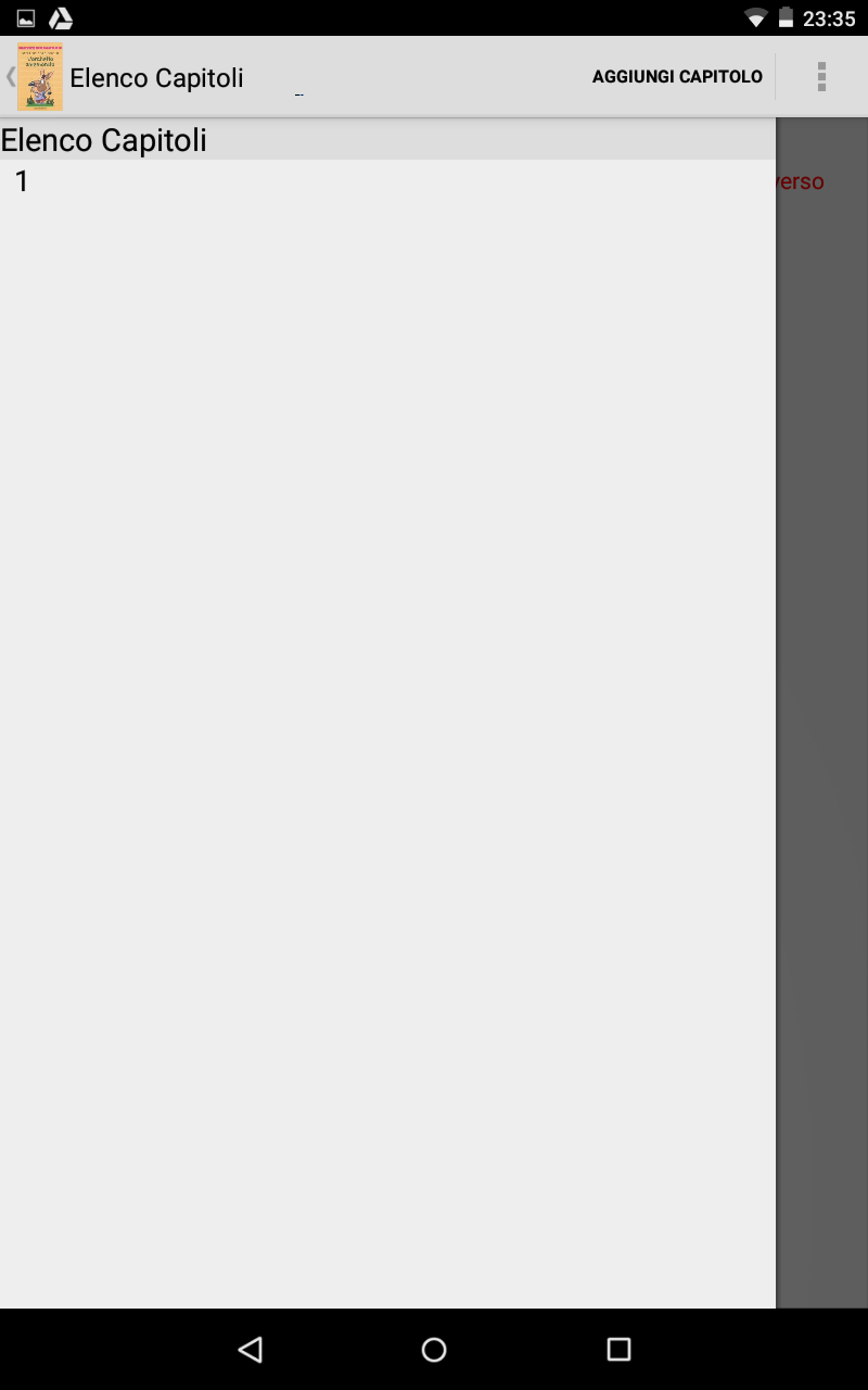 Il libro è suddiviso in capitoli. Per prima cosa quindi aggiungiamo un capitolo con la voce di menù AGGIUNGI CAPITOLO. Se apriamo quindi la tendina sulla sinistra tramite uno swype dal bordo sinistro verso il centro appare il capitolo appena creato. Seleziono il capitolo e iniziamo quindi nella fase di scrittura del titolo. Il menu ha le seguenti voci: